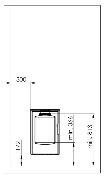 17,2cm fra bund af ovn og til brændbart gulv